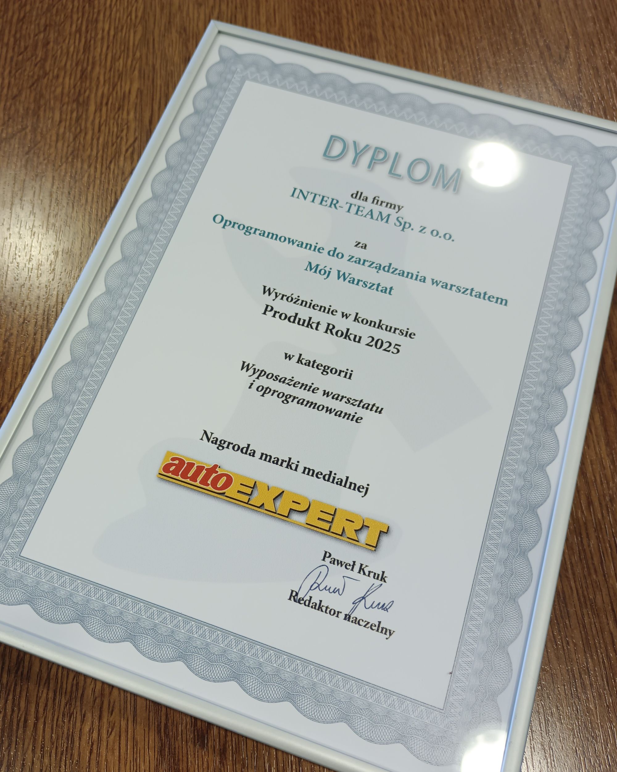 Jesteśmy szczególnie dumni z tego wyróżnienia, gdyż "Mój Warsztat" to autorskie oprogramowanie przygotowane przez zespół INTER-TEAM.